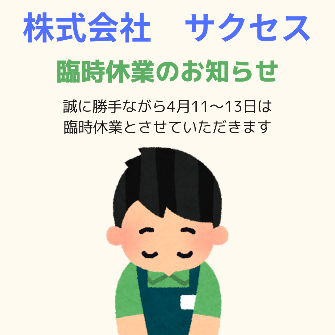 さて、この度臨時休業のお知らせです。4月11日~13日の3日間、お休みを頂戴いたします。この期間中、お電話での対応が難しいため、お手数をおかけいたしますがホームページからのメール問合せをお願い致します※ご質問やご相談のご返信は、20時以降に順次対応させて頂きますのでご了承下さいま